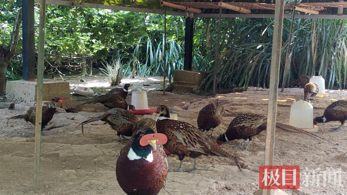 极目新闻记者随杨旭来到鸡舍巡护,但并没看到几只山鸡。杨旭进入围栏后,在栏边大吼几声,成群彩色山鸡,从草丛中飞出。