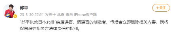 8月30日晚,郎平通过个人微博辟谣: