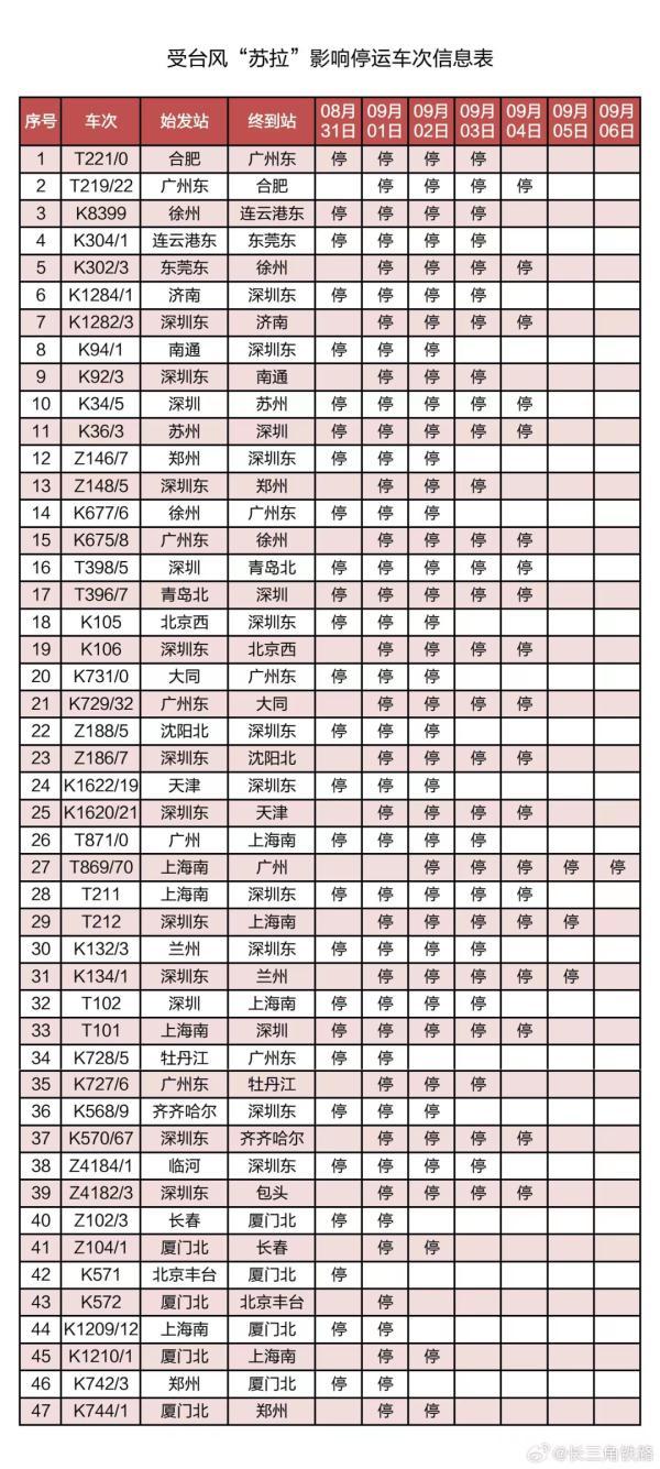 据中国铁路上海局集团公司消息,受第9号台风“苏拉”影响,为确保列车运行安全,铁路部门计划对杭深线、京港高铁、广深城际、广深港高铁、穗深城际、京九线等线路运行的部分列车采取停运措施。截至30日17时30分,计划停运8月31日至9月6日间共121趟旅客列车:其中停运动车组列车74趟,停运普速列车47趟。