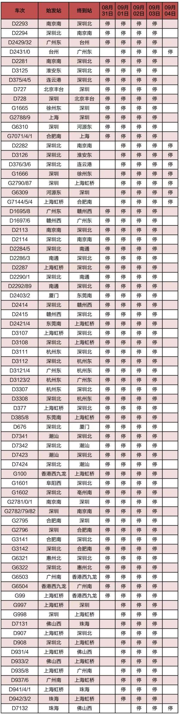 受第9号台风“苏拉”影响,为确保列车运行安全,铁路部门计划对杭深线、京港高铁、广深城际、广深港高铁、穗深城际、京九线等线路运行的部分列车采取停运措施。截至30日17时30分,计划停运8月31日至9月6日间共121趟旅客列车:其中停运动车组列车74趟,停运普速列车47趟。