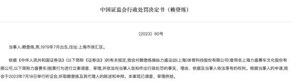 证监会最新更新披露的一则行政处罚决定书显示,证监会对赖登练操纵力盛运动(上海)体育科技股份有限公司(曾用名上海力盛赛车文化股份有限公司,以下简称力盛赛车)股票行为进行立案调查、审理发现,2020年1月3日至12月24日期间,赖登练控制使用账户组集中资金优势、持股优势,通过连续交易,或者在自己实际控制的账户之间进行证券交易,操纵、影响“力盛赛车”交易价格或者交易量。