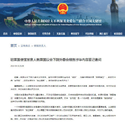 记者:英国议会下院外委会发布报告,宣称中国对英国利益构成“威胁”,污蔑中国搞所谓“跨国镇压”,鼓吹对华搞“去风险”,还把台湾称作“独立国家”。请问使馆对此有何评论?