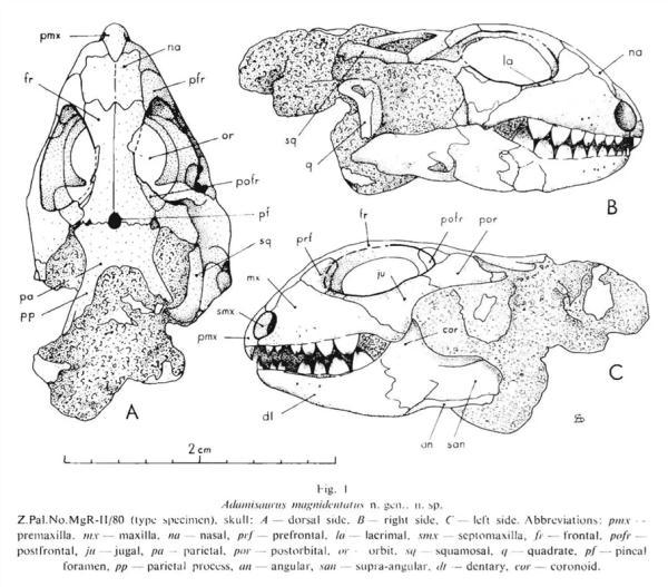 据了解,硕齿亚当蜥最早由波兰—蒙古古生物考察团于1964—1970年间在蒙古戈壁沙漠晚白垩世砂岩地层中采集到,相关专家于1972年对其带下颌的不完整头骨进行了初步描述,建立了亚当蜥属,并根据其“牙齿硕大”这一显著特征对其进行了命名。
