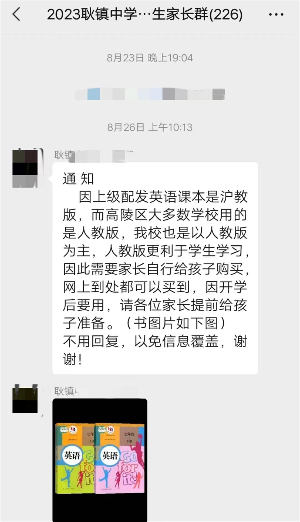 群聊记录显示,校方工作人员于8月26日发布通知称:“因上级配发的英语课本是沪教版,而高陵区大多数学校用的是人教版,我校也是以人教版为主,人教版更利于学生学习,因此需要家长自行给孩子购买。网上到处都可以买到,因开学后要用,请各位家长提前给孩子准备。”通知还附带了人教版七年级英语上下册示例图。