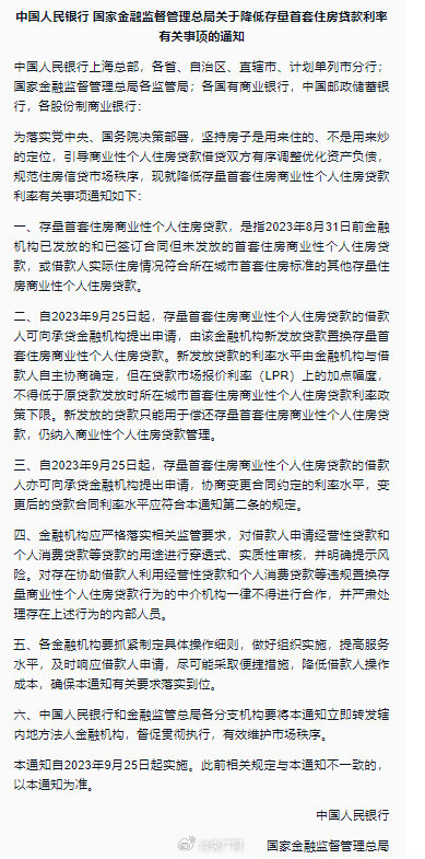 中国人民银行、国家金融监督管理总局就降低存量首套住房贷款利率有关事项发布通知。(央视新闻)