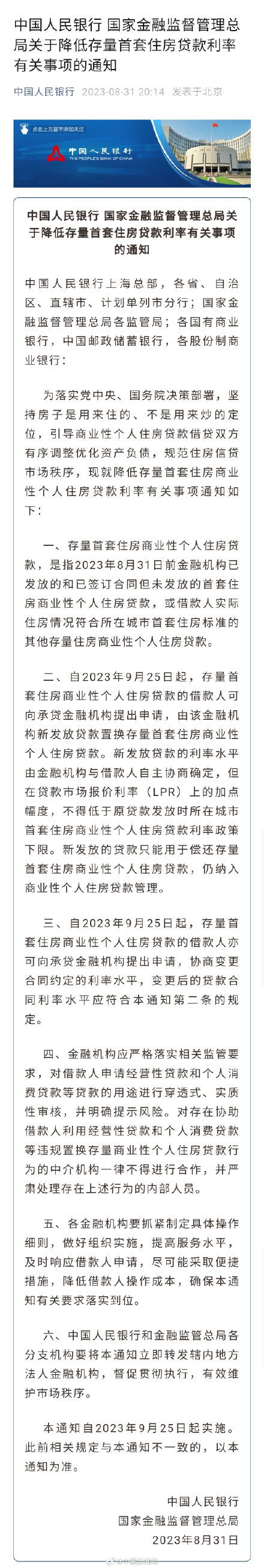 中国人民银行、国家金融监督管理总局发布关于降低存量首套住房贷款利率有关事项的通知,其中提到,自2023年9月25日起,存量首套住房商业性个人住房贷款的借款人可向承贷金融机构提出申请,由该金融机构新发放贷款置换存量首套住房商业性个人住房贷款。新发放贷款的利率水平由金融机构与借款人自主协商确定,但在贷款市场报价利率(LPR)上的加点幅度,不得低于原贷款发放时所在城市首套住房商业性个人住房贷款利率政策下限。新发放的贷款只能用于偿还存量首套住房商业性个人住房贷款,仍纳入商业性个人住房贷款管理。(中国人民银行)