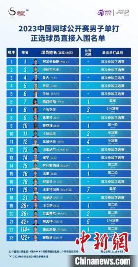 2023中国网球公开赛男子单打正选球员直接入围名单。中网赛事组委会提供