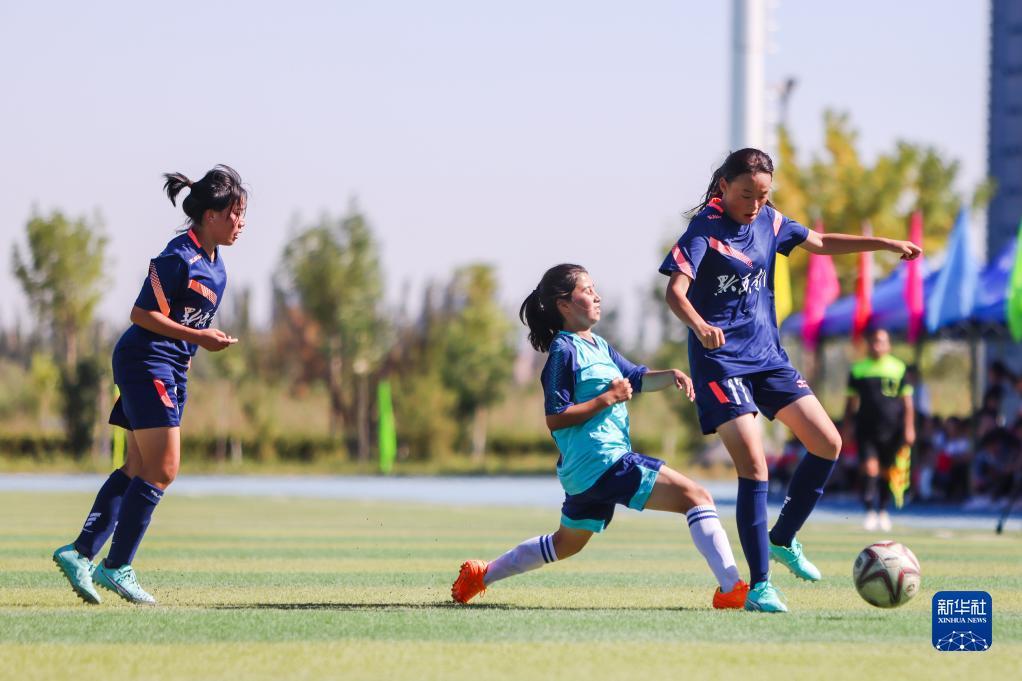 8月30日,在喀什赛区,黔西南U15女队和喀什U15女队的参赛选手在比赛中拼抢。新华社记者 郝昭 摄
