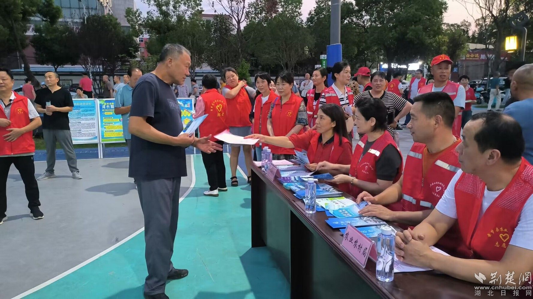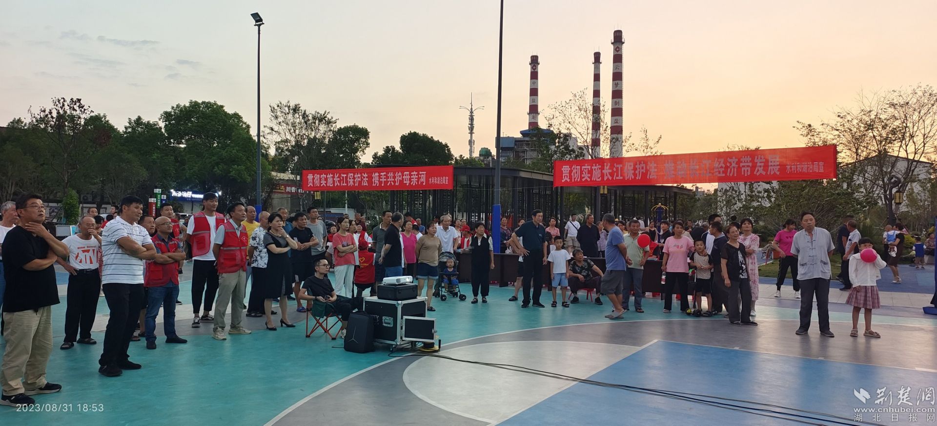 晚上7点,公园里凉风习习,游人如织。该局与相关单位在这里设置宣传点,悬挂横幅,摆放长江保护相关法律法规、“深入推进河湖‘清四乱’常态化、规范化”“城乡居民饮用水安全”等内容的宣传展板。48名志愿者身穿红马甲,向园内群众发放宣传手册、折页、海报、挂图等600余份,讲解《长江保护法》的立法目的、适用范围等知识,大力提升法律的知晓率,让《长江保护法》深入人心。