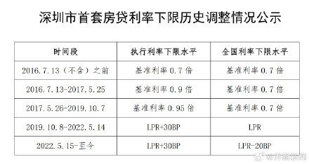 9月1日,央行深圳市分行公示深圳市首套房贷利率下限历史调整情况。2022.5.15-至今,深圳执行利率下限水平为LPR+30BP,全国利率下限水平为LPR-20BP。