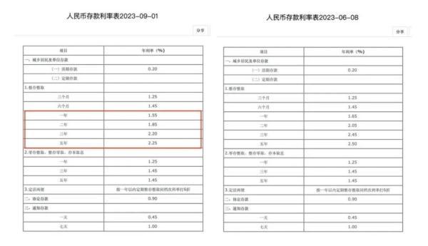 9月1日早上,国有大行纷纷关于调整人民币存款利率的公告。从调整的期限品种、幅度来看,1年期定期存款挂牌利率均下调10个基点至1.55%(邮储银行除外,该行降至1.58%),2年期下调20个基点至1.85%,3年期下调25个基点至2.2%,5年期下调25个基点至2.25%。