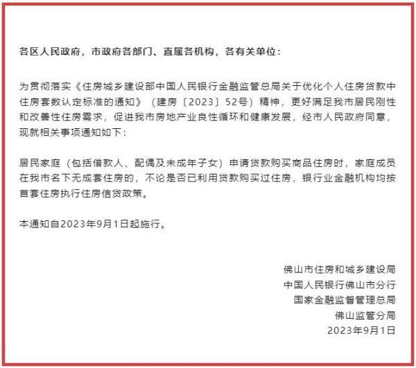 央视网消息:据“佛山住建”微信公众号消息,佛山市住房和城乡建设局等部门发布《关于优化我市个人住房贷款中住房套数认定标准的通知》,具体内容如下。