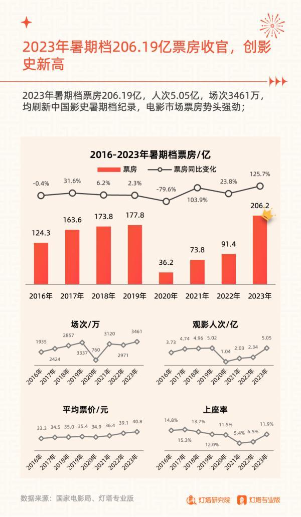 2023年暑期档电影票房206.19亿元,同比增长125.7%,观影人次为5.05亿,场次为3461万,票房、观影人次、场次均刷新中国影史暑期档纪录。