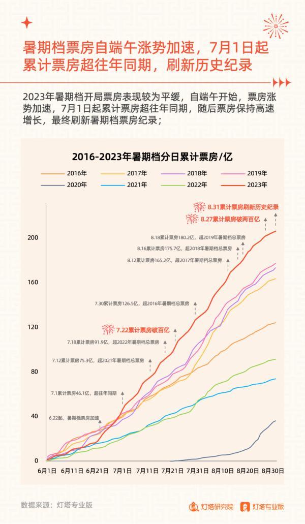2023年暑期档开局较为平稳,自端午开始票房涨势加速,陆续在7月12日、7月18日、7月30日、8月12日、8月16日、8月18日分别超过2021年、2022年、2016年、2017年、2018年、2019年暑期档总票房。