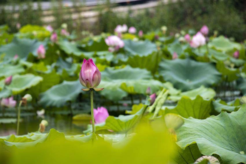 远远望去,一幅浑然天成的水墨画呈现眼前,粉色和翠绿填满整个视野,碧绿的荷塘与恬静的乡村交相映衬,勾勒出一幅自然和谐的美丽画卷,充满诗意。