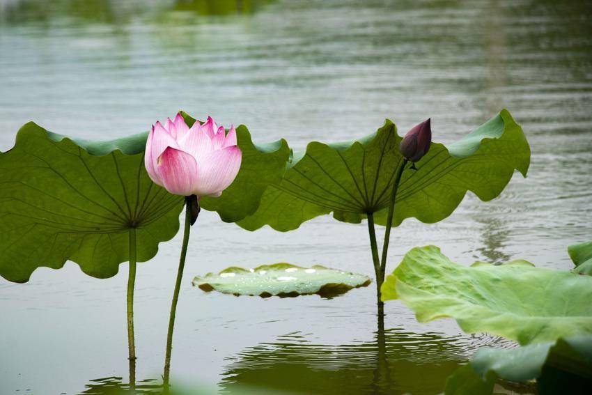粉色的荷花在绿叶的陪衬下,犹如落入凡尘的仙子,美得不可方物。