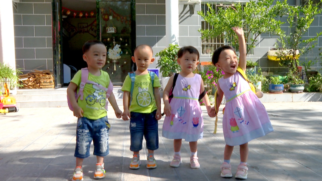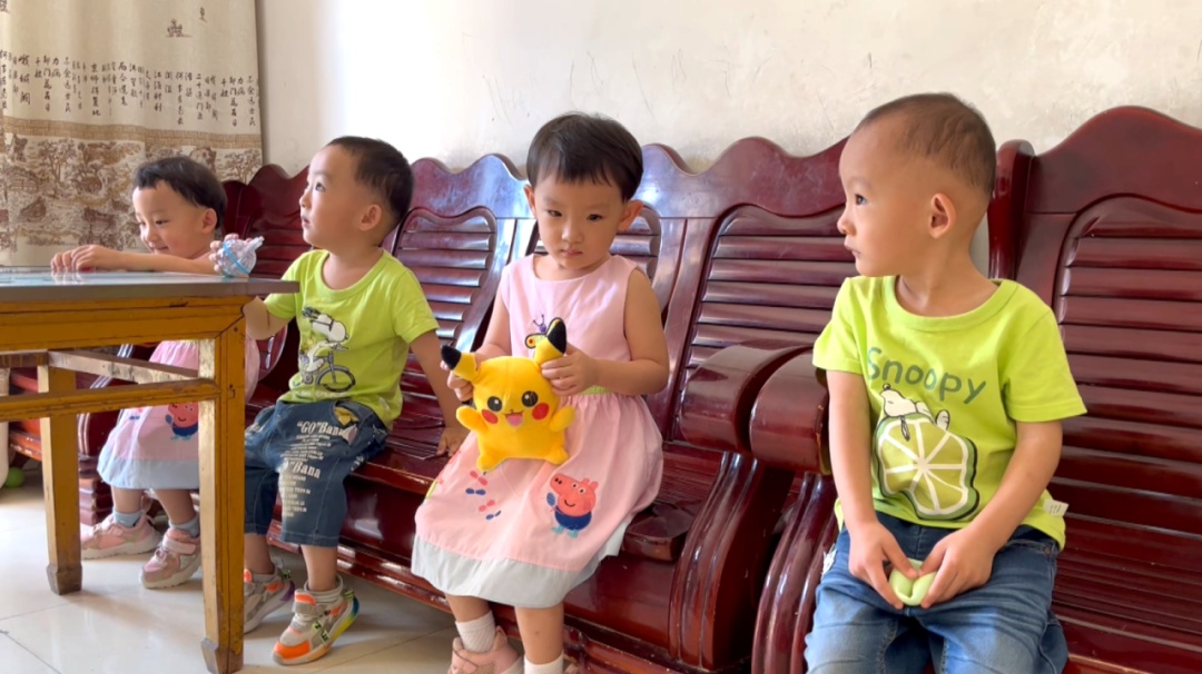 今天,是他们家四胞胎国强、一菲、一凡、小康去幼儿园的第一天。四胞胎在妈妈、奶奶的帮助下,穿好了衣服,背好了书包。就这样,妈妈和奶奶一人领着一对娃就踏上了去幼儿园的路程。