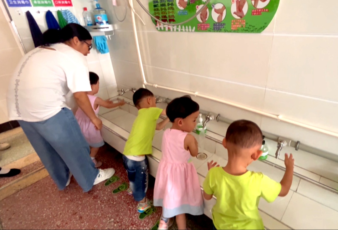 孩子们要去的是后河幼儿园,虽然离家只有几分钟的路程,但孩子们哭哭闹闹地走了10多分钟。在幼儿园门口,四胞胎这一家子格外引人注目。