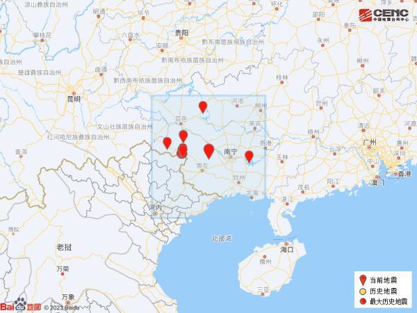 历史地震:根据中国地震台网速报目录,震中周边200公里内近5年来发生3级以上地震共11次,最大地震是2019年11月25日在广西百色市靖西市发生的5.2级地震(距离本次震中98公里),历史地震分布如图。