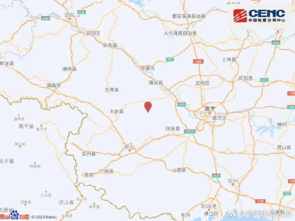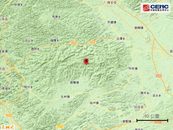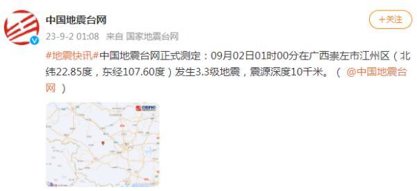 据中国地震台网中心官方微博9月2日消息,中国地震台网正式测定:09月02日01时00分在广西崇左市江州区(北纬22.85度,东经107.60度)发生3.3级地震,震源深度10千米。