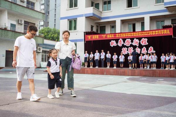 9月1日,在重庆市九龙坡区,豆豆在爸爸妈妈的陪伴下走向学校。