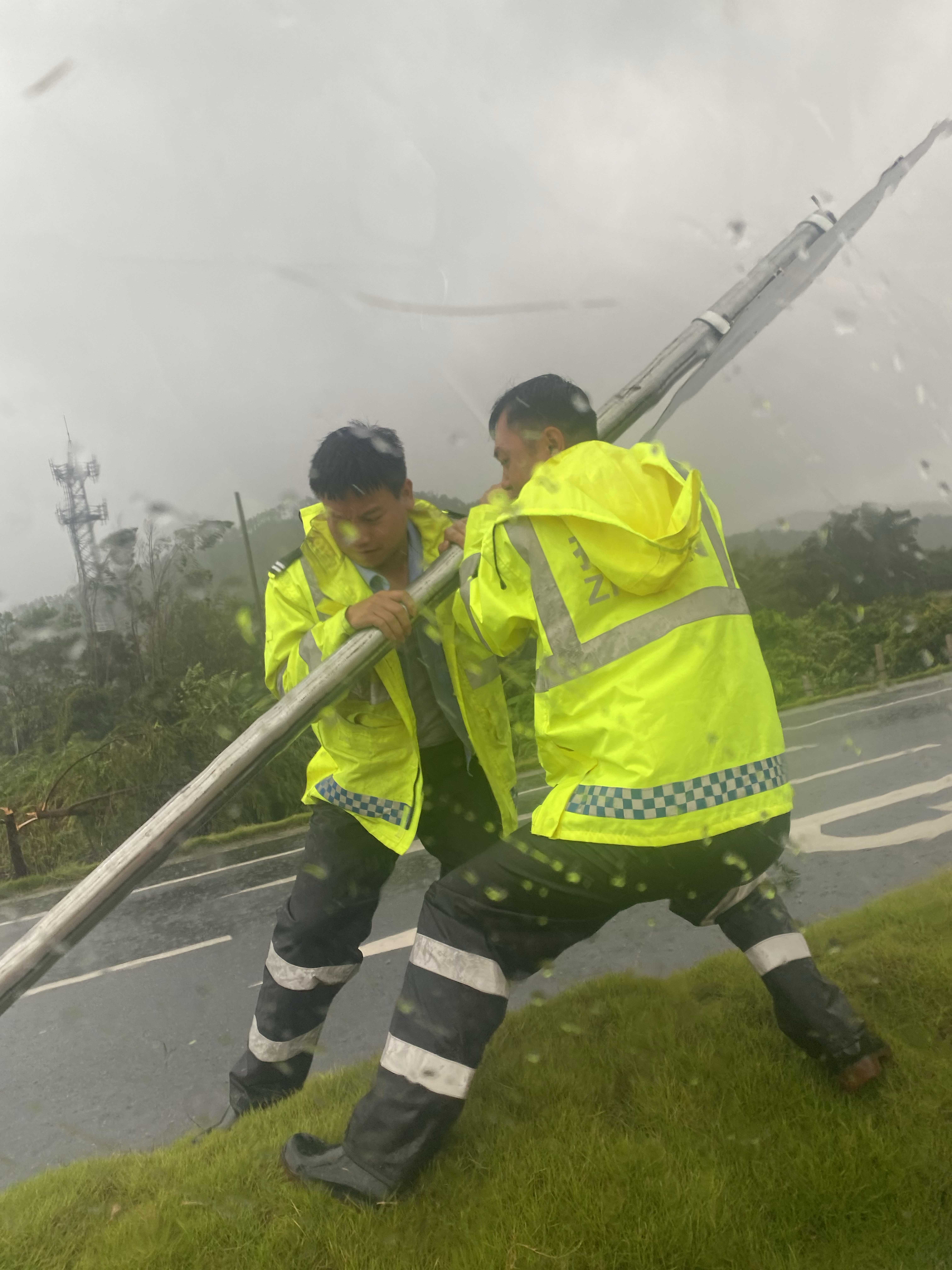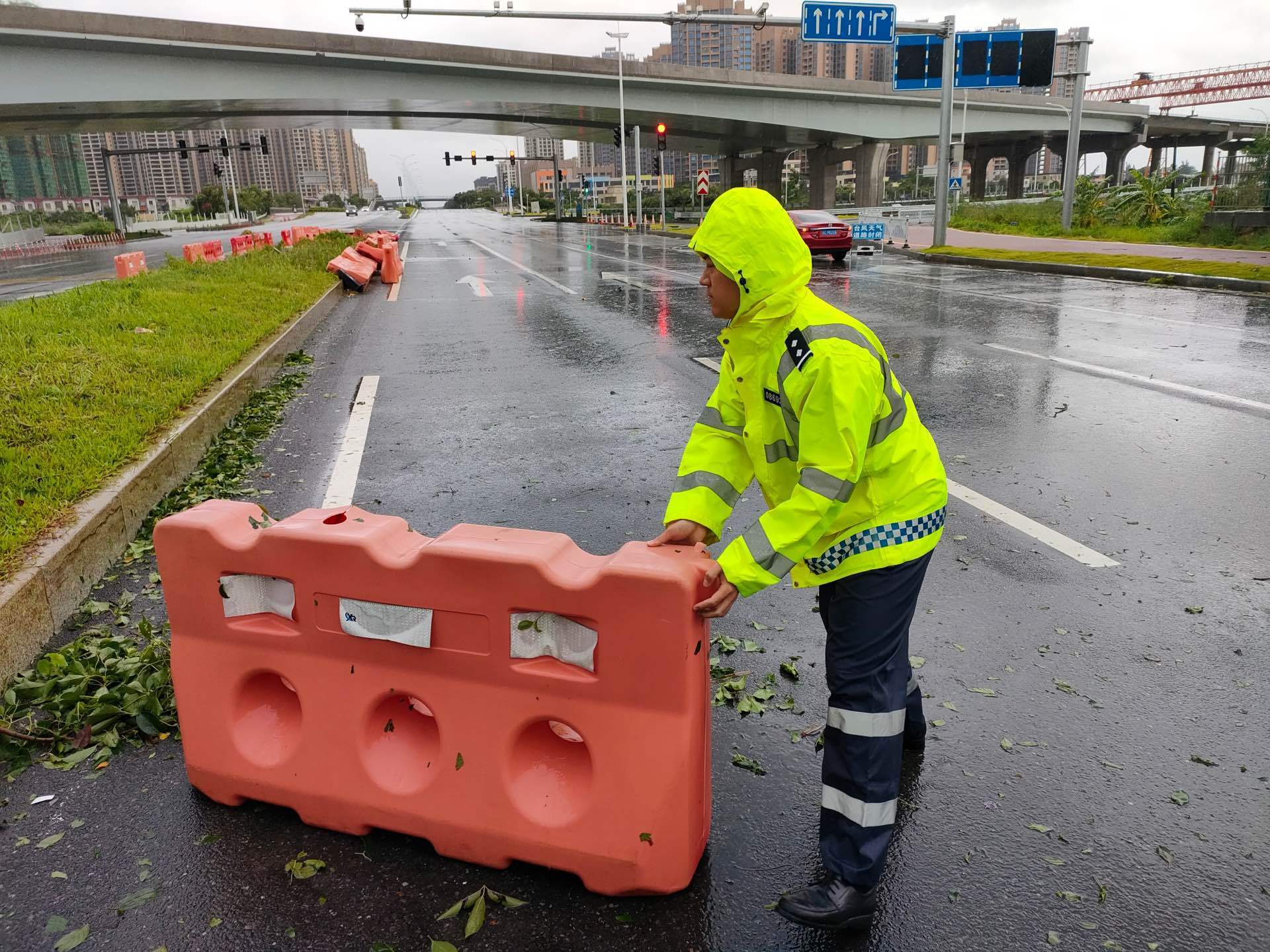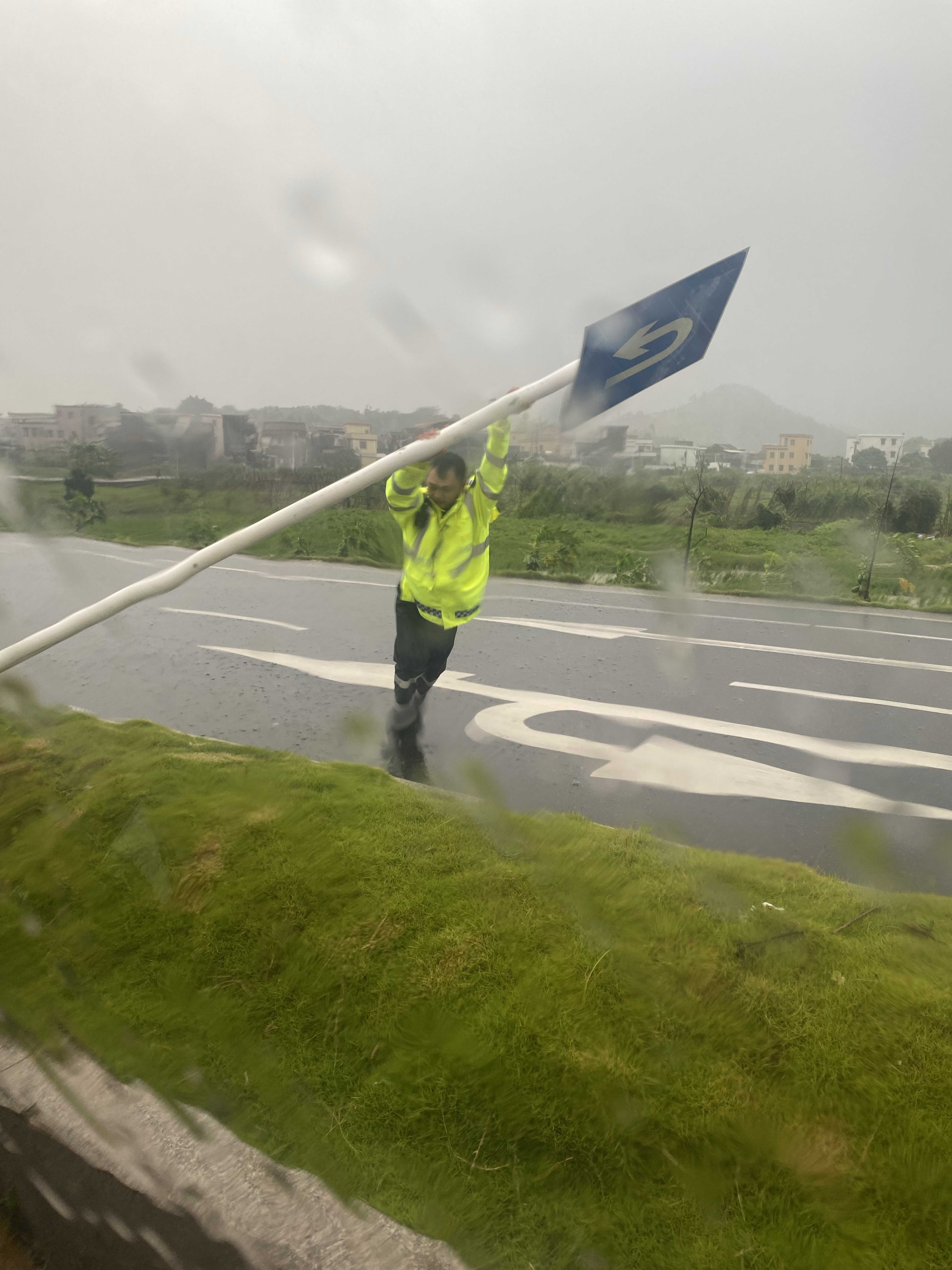 排查因台风吹到地上的护栏、标志牌、