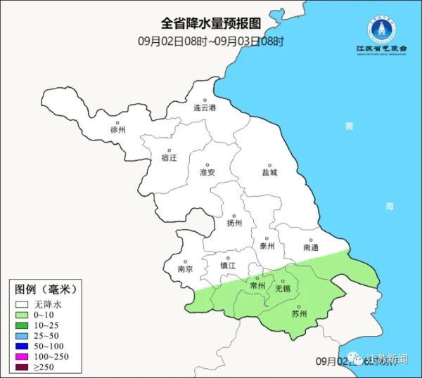 9月02日08时至9月03日08时:白天全省晴到多云,夜里苏南地区阴有阵雨或雷雨,其他地区多云。最高温度:全省29℃左右;最低温度:淮北北部地区20℃左右,本省东南部地区23℃左右,其他地区21~22℃。全省东北风4-5级。