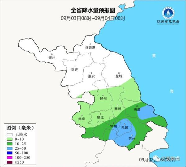 9月03日08时至9月04日08时:江淮之间南部和苏南地区阴有阵雨或雷雨,其中本省东南部地区雨量中等,局部大雨,其他地区多云。最高温度:沿淮和苏南地区26℃左右,其他地区28~29℃;最低温度:淮北地区19~20℃,本省东南部地区24℃左右,其他地区22~23℃。全省东北风4-5级。