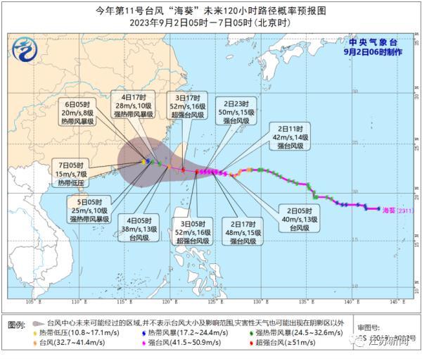 登陆后,“苏拉”再次移入广东省珠海市南部近海,今天早晨由强台风级减弱为台风级(14级,42米/秒),中心最低气压为955百帕。