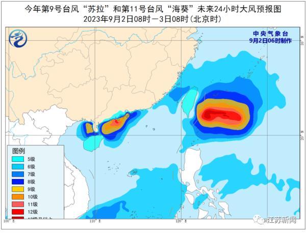 预计今明两天,“苏拉”将以每小时10-15公里的速度向西偏南方向移动,强度逐渐减弱,并向雷州半岛东部近海靠近。未来24小时,广东西南部、广西东南部、香港、澳门以及云南西部、台湾岛东部等地部分地区有大到暴雨,其中,广东西南部部分地区有大暴雨;南海西北部、北部湾东部、琼州海峡及广东沿海、广西南部沿海、珠江口以及香港和澳门等地将有7-9级、阵风10-11级的大风,“苏拉”中心经过的附近海面或地区风力有12-13级、阵风14-15级。