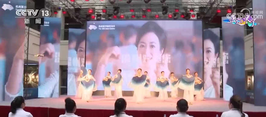 今天在现场我们感受到全民健身的氛围越来越浓了。在今天的整个比赛过程中,有很多的参赛队伍,他们所用的背景音乐充满了亚运的元素,就像此刻台上正在进行的这支队伍,他们的背景音乐就是杭州亚运会主办城市的推广曲《最美的风景》,我们可以听到,在这个背景音乐当中融入了极具江南风味儿的古筝和琵琶,让我们感受到了江南韵味。同时,通过这个大屏幕,我们也能够看到很多温州市的地标性的建筑,向我们展示了这座协办亚运城市温州给大家带来的活力和激情,当然也能够让我们深刻地感受到体育让生活更美好。