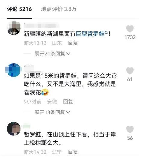 还有网友表示,有可能是哲罗鲑鱼。据介绍,哲罗鲑鱼是一种极其珍贵的大型肉食性凶猛鱼类,青年期体长1-2米,成年期体长2-5米,其中的老寿星“巨无霸”可长至10余米,重达1-2吨。