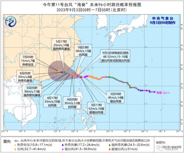 台风大风灾害风险:受“海葵”影响,3~4日闽中、闽南、台湾浅滩渔场、闽东渔场西部以及沿海海区的台风大风灾害风险等级较高;沿海地区需做好防风防浪工作并做好滨海旅游和沿海养殖的安全管理。
