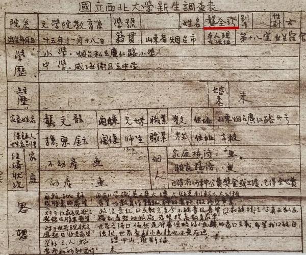 龚全珍填写的《国立西北大学新生调查表》