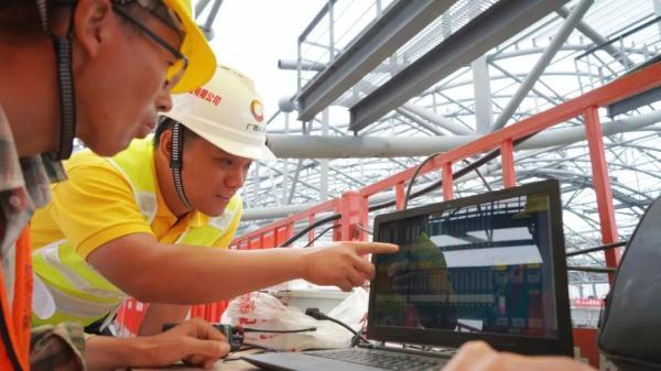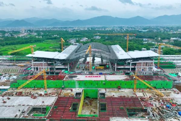 在智能化数控设备操控下,高架站房屋盖钢桁架结构顺利完成提升对接,实现了大跨度钢桁架“一次整拼成型、一次起升到位、一次精准对接”的预定目标,玉林北站“凤凰展翅”的外观设计得到展现,站房立面效果雏形显现。