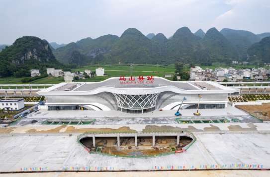 贵南高铁是“八纵八横”高速铁路网包头(银川)至海口通道的重要组成部分,线路自贵阳铁路枢纽龙里北站引出,向南经贵州省黔南布依族苗族自治州,广西河池市、南宁市,接入南宁铁路枢纽南宁东站,线路全长482公里,设计时速350公里。贵南高铁广西段共有6座新建站房,中铁北京局承建其中5座站房,包括马山县站、都安站、永安镇站、河池西站、环江站。