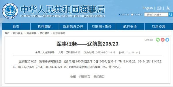 据中国海事局网站消息,大连海事局发布航行警告,自9月3日16时至9月10日16时,渤海海峡黄海北部执行军事任务,禁止驶入。