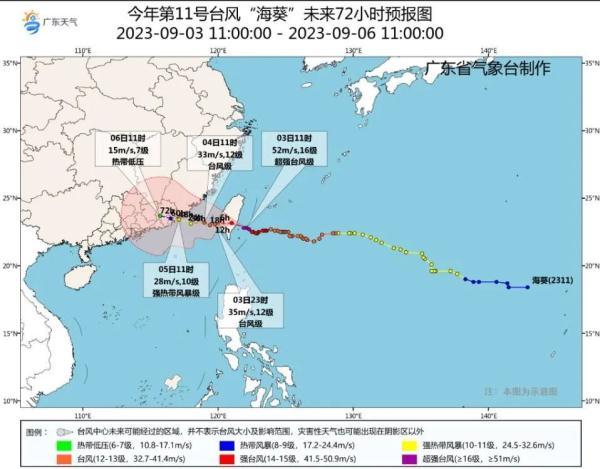 海上大风预报:3日,北部湾海面、粤西海面风力5~7级、阵风8级,趋于减弱。4日-5日,受“海葵”影响,台湾海峡、粤东海面风力将加大到7~10级,台风中心经过的附近海面11~13级、阵风14~15级,南海东北部海面风力7~10级。