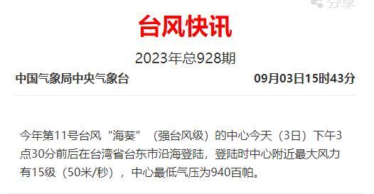 福州市气象台2023年09月03日15时24分将台风蓝色预警信号升级为台风黄色预警信号。