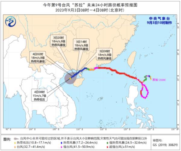 3日早上,“苏拉”以热带风暴级进入北部湾海面,11时减弱为热带低压。预计它将以每小时10~15公里的速度向西偏南方向缓慢移动,强度逐渐减弱。其减弱后的低压环流将继续在北部湾海域回旋,今明两天(3日、4日)桂中、桂南和北部湾仍有较强风雨天气,需继续做好防御工作,预计到5日“苏拉”对广西的风雨影响才会有所减弱。