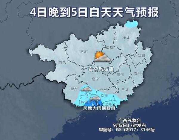 4日晚上到5日白天,防城港、钦州、北海等市有小到中雨、局地大雨到暴雨,我区其他地区多云有分散阵雨。