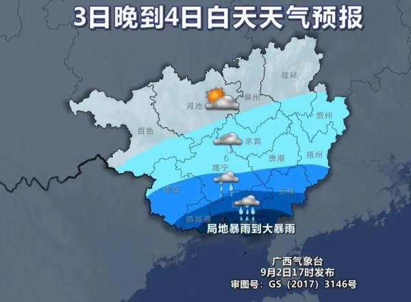 3日白天,南宁、崇左、来宾、贵港、玉林等市和百色南部、河池南部有大雨到暴雨、局地大暴雨,我区其他地区多云有阵雨、局地大雨。桂南有5~6级、阵风7~8级大风。