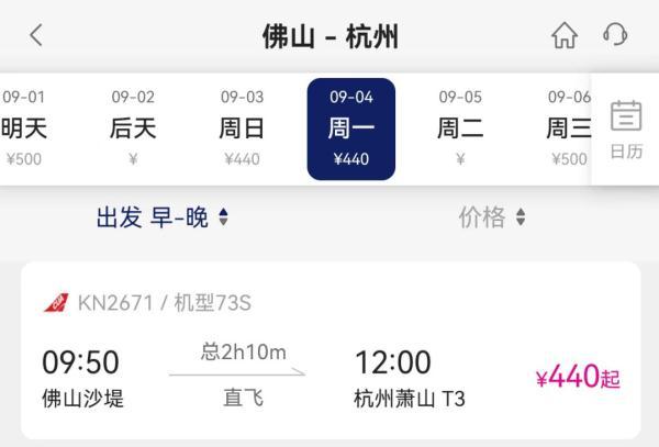 9月1日起,每周一、三、五、七,佛山往杭州方向9点50分起飞,12点00分抵达,杭州往佛山方向13点10分起飞,15点20分抵达。