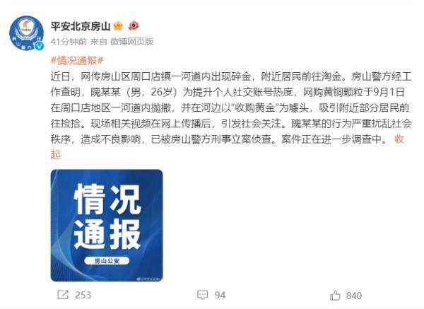 据@平安北京房山微博9月3日通报,近日,网传房山区周口店镇一河道内出现碎金,附近居民前往淘金。房山警方经工作查明,隗某某(男,26岁)为提升个人社交账号热度,网购黄铜颗粒于9月1日在周口店地区一河道内抛撒,并在河边以“收购黄金”为噱头,吸引附近部分居民前往捡拾。现场相关视频在网上传播后,引发社会关注。隗某某的行为严重扰乱社会秩序,造成不良影响,已被房山警方刑事立案侦查。案件正在进一步调查中。