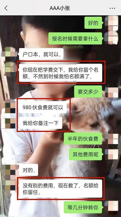 “你现在先交一下费用,我给你留个名额……”随后,“张老师”称怕入学名额满了,便让王女士先交980元的伙食费,微信直接转账即可,会帮她备注好信息。王女士又询问是否还有其他费用,“张老师”只是一个劲儿地催她赶快交钱,好留住名额。这时,王女士突然警觉起来,心里开始有些怀疑,想到学校缴费一般不会通过个人转账,于是便称稍晚再给对方转钱。