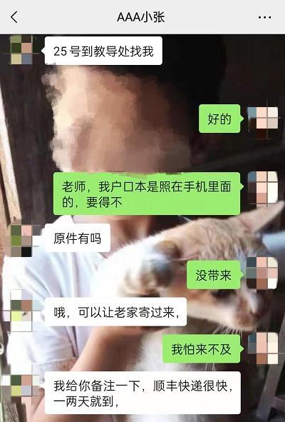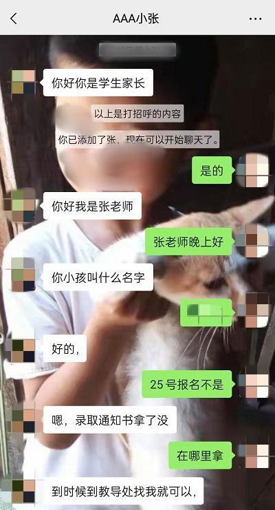 8月23日晚上,家长群里名叫“AAA小张”的人主动添加王女士为微信好友。对方自称是“张老师”,询问了小孩的姓名和基本情况,还告知王女士25号到教导处找他拿录取通知书。由于转学需要户口簿等相关证件原件,“张老师”还特别贴心地嘱咐王女士让人尽快从老家快递邮寄过来。