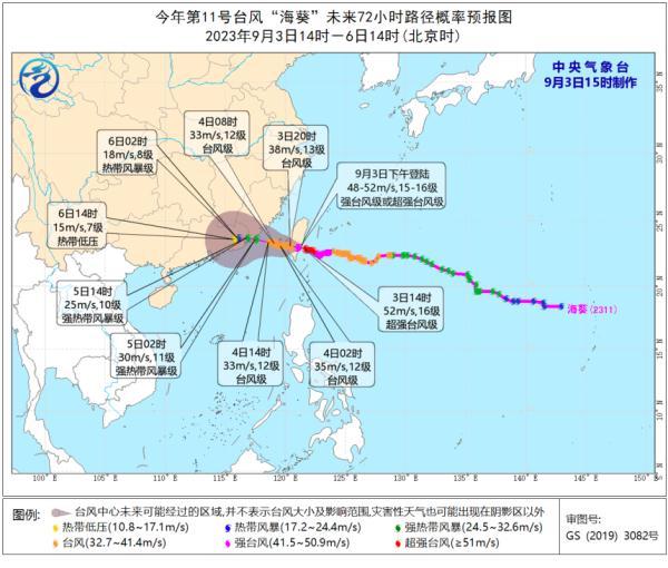 降水预报:9月3日14时至4日14时,受“苏拉”和“海葵”影响,广西中南部、福建东部沿海、台湾岛等地有大到暴雨,其中,广西中南部、台湾岛中东部等地部分地区有大暴雨,台湾岛东部局地有特大暴雨(250-600毫米);上述地区伴有短时强降水(最大小时降雨量30-50毫米,局地可超过60毫米),局地有雷暴大风等强对流天气。