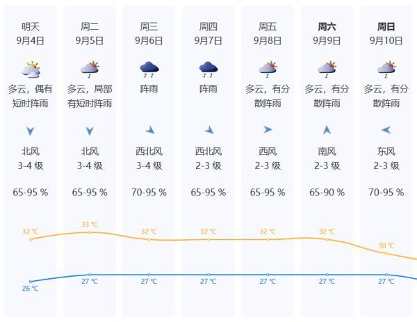 深圳今日晴天间多云,午后有阵雨,最高气温32℃左右。4日晴天间多云,局部有短时阵雨,天气炎热。预计5-7日受“海葵”环流影响,我市降雨明显增多。全市地质灾害的风险较高,请继续做好地质灾害相关防御工作。下周中后期我市降雨活跃,需关注“海葵”的相关动态并提早做好防御措施。