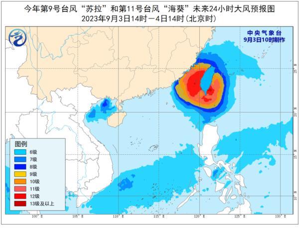 大风预报:9月3日14时至4日14时,受“苏拉”影响,北部湾和广西南部沿海将有6-7级大风,其中北部湾北部部分海域将有8级、阵风9-10级的大风;受“海葵”影响,巴士海峡、台湾海峡、台湾以东洋面、东海南部及钓鱼岛附近海域、南海东北部偏东海域以及浙江南部沿海、福建沿海、广东东部偏东地区沿海、台湾岛沿海将有6-8级、阵风9-10级大风,部分海域或地区的风力有9-12级,阵风13-14级,“海葵”中心经过的附近海面或地区的风力有13-16级,阵风16-17级。
