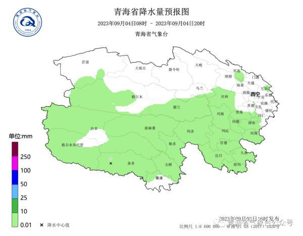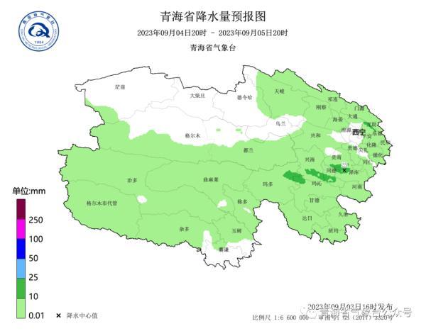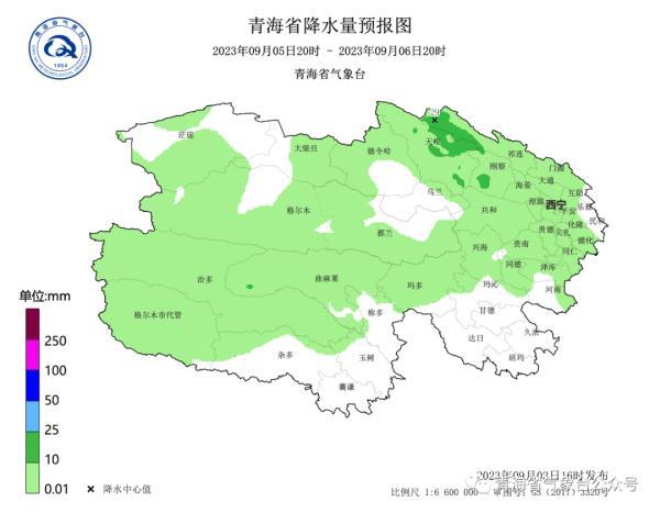 9月5日20时~9月6日20时:西宁、海东大部、海北、海西大部、海南、黄南大部、玉树西部、果洛北部有小雨或阵雨,其中天峻、祁连、刚察的部分乡镇有中雨,省内其余地区晴或多云。